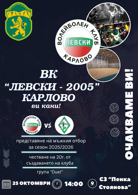 Волейболният клуб "Левски" в Карлово ще празнува 20-годишнина със специално събитие. То ще бъде на 25 октомври, от 14,00 часа, в спортна зала "Пенка Стоянова".