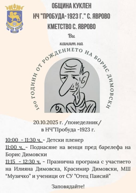 Куклен ще почете паметта на художника Борис Димовски за 100 години от рождението му. На 20 октомври, когато е рождената дата на карикатуриста, ще има няколко интересни събития. Вижте програмата в приложения плакат.