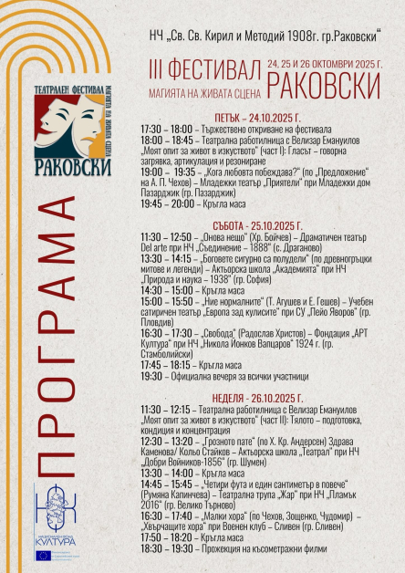 Театралния фестивал "Магията на живата сцена" започва тази вечер в Раковски и ще продължи три поредни дни - на 24, 25 и 26 октомври 2025 г.