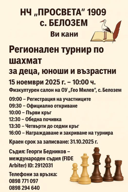 Приятелски турнир по шахмат, подходящ за любители и начинаещи, ще се проведе в читалище "Просвета" в село Белозем, община Раковски.