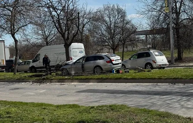 БМВ е катастрофирало на ул. "Цар Симеон", преди пресечката с ул. "Гочо Грозев". Машината е със значинелни щети по предницата, качена е на разделителния остров, като има и отнесено дърво.