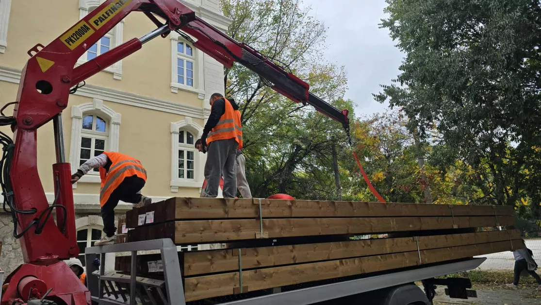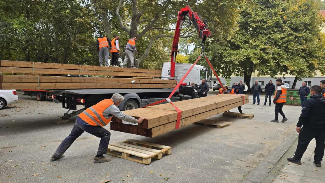 Първите 120 греди за ремонта на Хуманитарната гимназия вече са доставени. През целия уикенд ще бъдат разтоварени и останалите 120 броя. Те са изработени от бял смърч, всяка тежи 170 кг. Дължините им са 7,2 и 7,4 м.