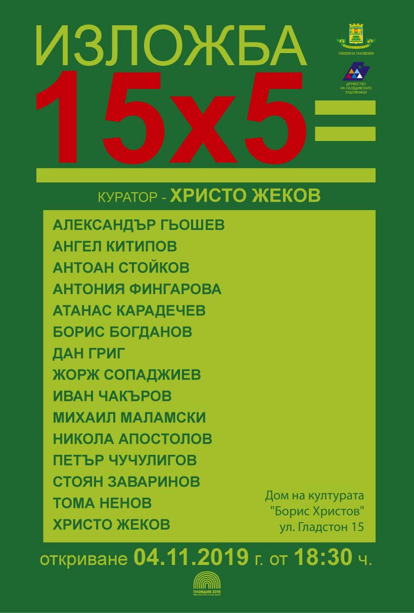 В понеделник, 4 ноември в 18.30 часа ще бъде открита традиционната изложба „15Х5“ на Дружеството на пловдивските художници. Експозицията е подредена в Дома на културата „Борис Христов“, фоайе, ет.2.