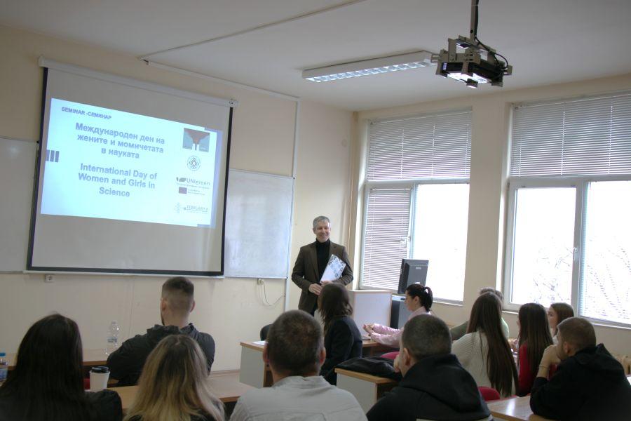 Проф. д-р Димо Атанасов, заместник-ректор по научна и международна дейност на Аграрния университет, откри семинара, подчертавайки значението на подобни инициативи за насърчаване на равенството, вдъхновението и видимостта на жените в научната общност.