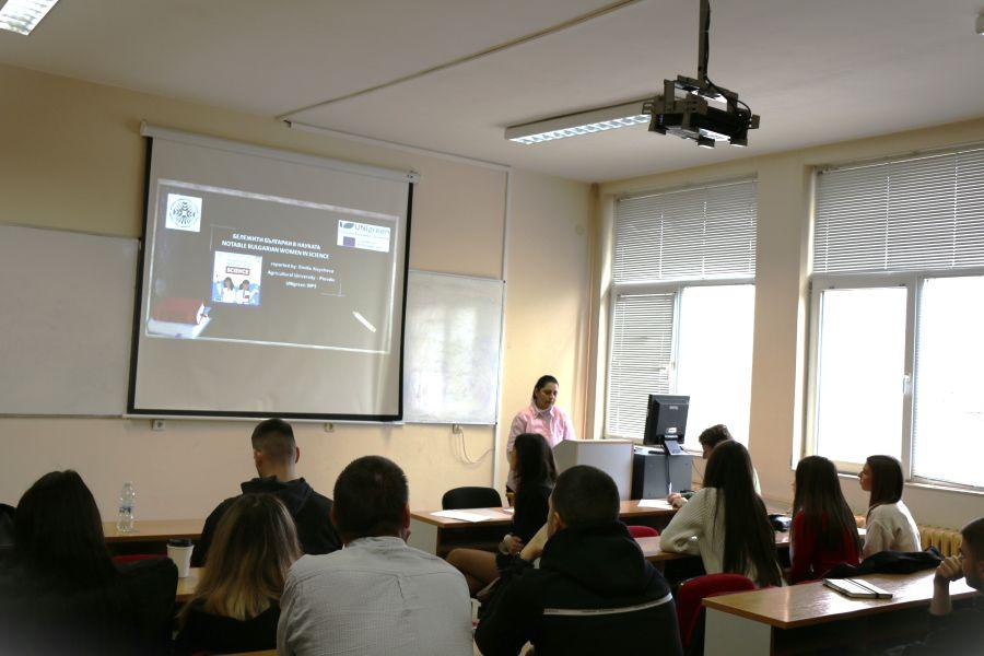 В рамките на събитието старши преподавател Емилия Койчева от Департамента за езикова подготовка и спорт (ДЕПС) запозна аудиторията с бележити български жени учени, като открои техния принос към различни научни области и развитието на науката в страната и по света.