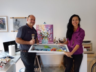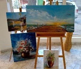 В картините от масло пресъздават пейзажи от морето и прекрасни кътчета на страната, както и модернистични и градски сюжети. Обединяваща темата и за двамата автори е романтиката и красотата на цветята.