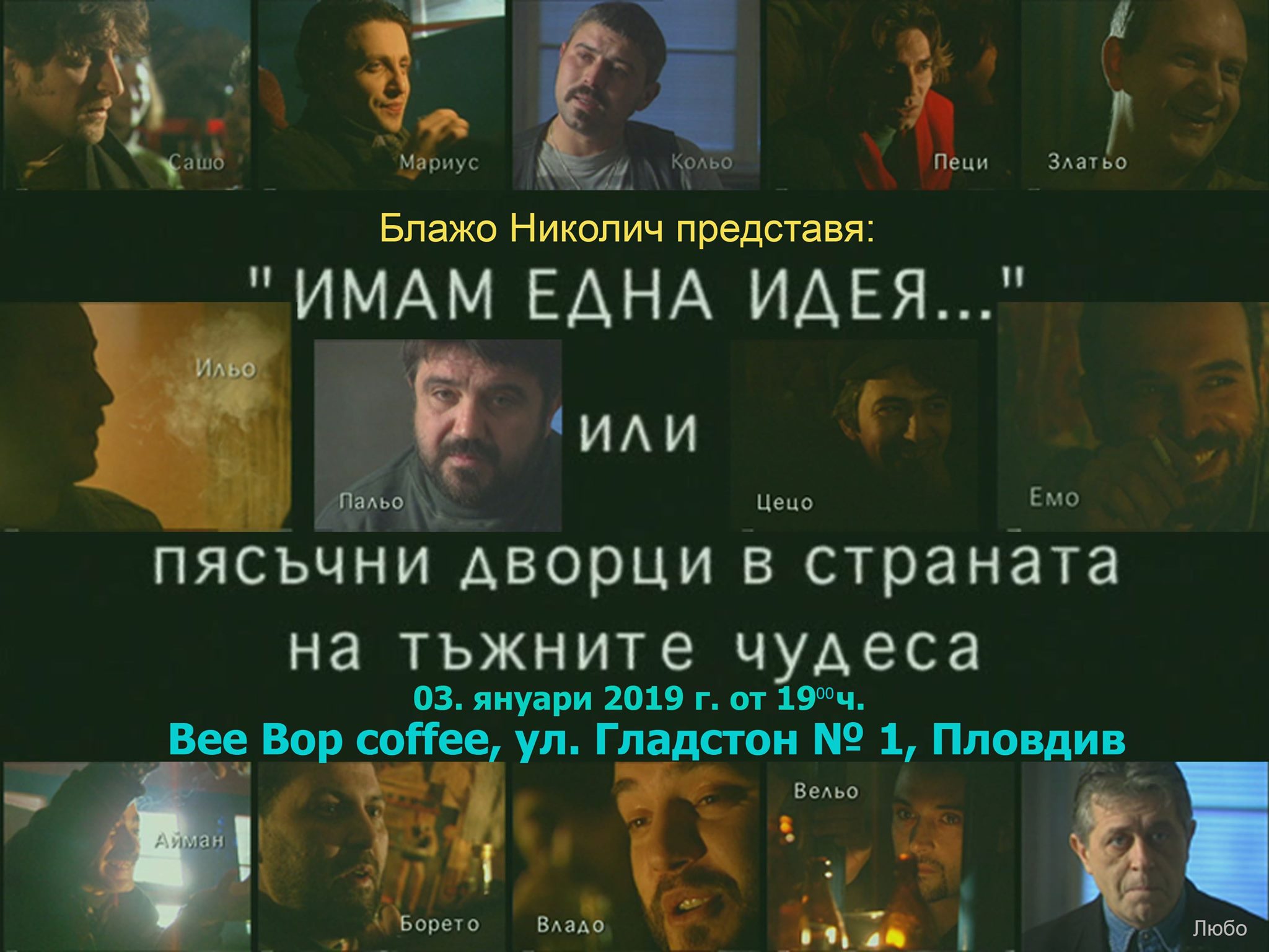 Блажо Николич и Би Боп Кафе представят: "Имам една идея..." или пясъчни дворци в страната на тъжните чудеса. На 3-ти януари от 19:00ч Bee Bop Café ви кани на кино вечер. Поводът е филм, разказващ за едни хора, които имат едни идеи. Голяма част от тези хора вече не са сред нас, но те и идеите им са неизменна част от съвременната култура и изкуство.