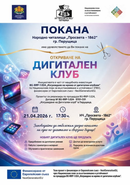 Миталище „Просвета“ в Перущица се включва в националната инициатива за изграждане на мрежа от дигитални клубове, финансирана по Националния план за възстановяване и устойчивост с подкрепата на Европейския съюз.