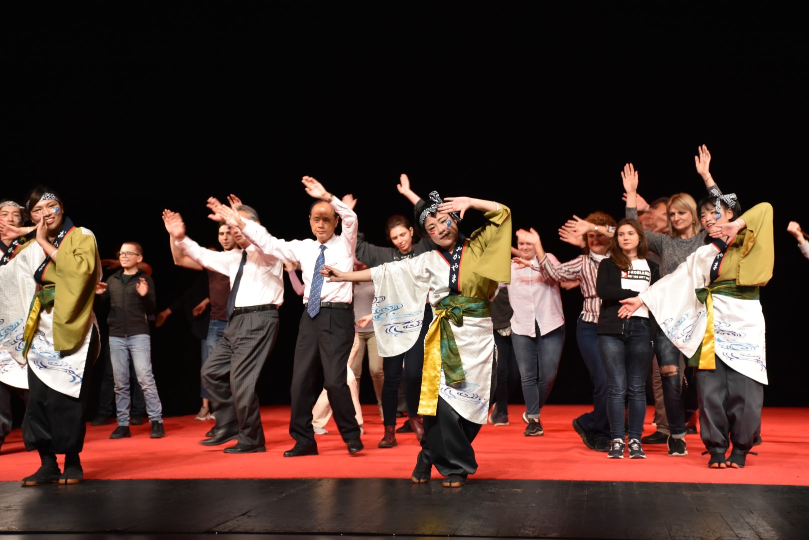Великолепен спектакъл на японското танцово и музикално изкуство представиха изпълнители от побратимения на Пловдив град Окаяма в Дом на културата „Борис Христов“ вчера вечерта. Традиционният танц Ураджа* плени публиката със своя уникалност, хармония и енергичност. Зрителите бяха толкова впечатлени, че се включиха в самия танц на сцената, а сред най-активните беше кметът на Окаяма Масао Омори.