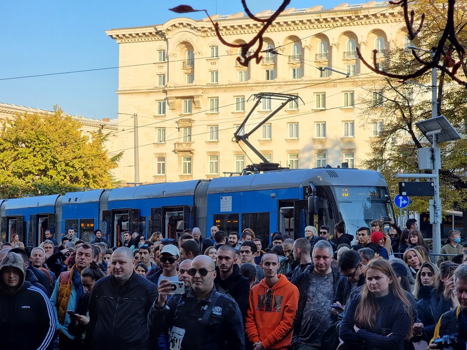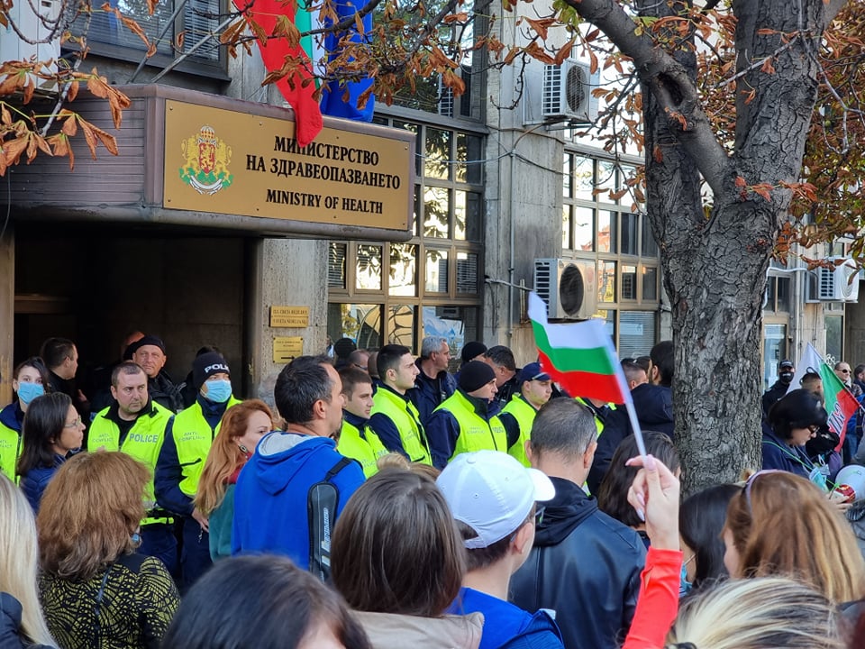 Голям протест на стотици недоволни от въвеждането на зелените сертификати тече пред Министерството на здравеопазването в София.