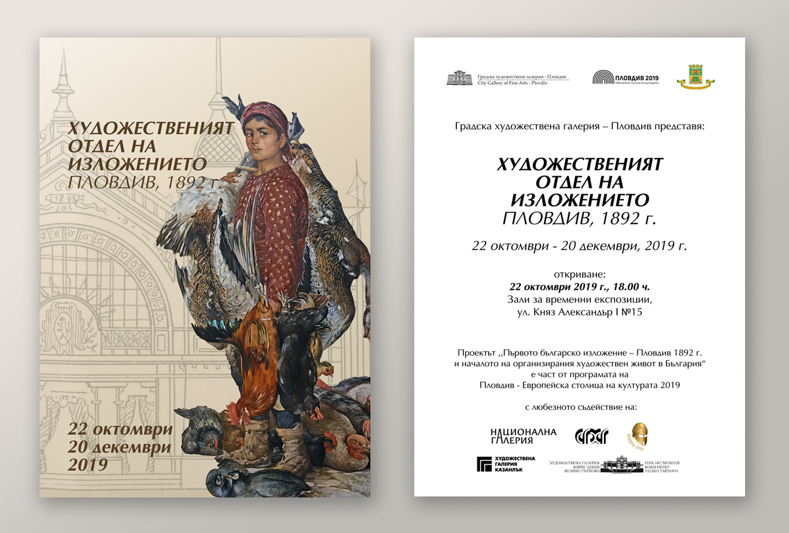 На 22 октомври от 18.00 ч. в Залите за временни експозиции на ул. „Княз Александър I“ №15 ще се открие проектната изложба „Художественият отдел на Изложението - Пловдив 1892 г.“, създадена от екип на Градската художествена галерия въз основа на научните изследвания на изкуствоведа Пламен Петров и кураторските решения на Красимир Линков, изкуствовед и директор на галерията. Експозицията се осъществява по проект „Първото българско изложение – Пловдив 1892 г. и началото на организирания художествен живот в България“ и е част от официалната програма на Пловдив – Европейска столица на културата 2019.