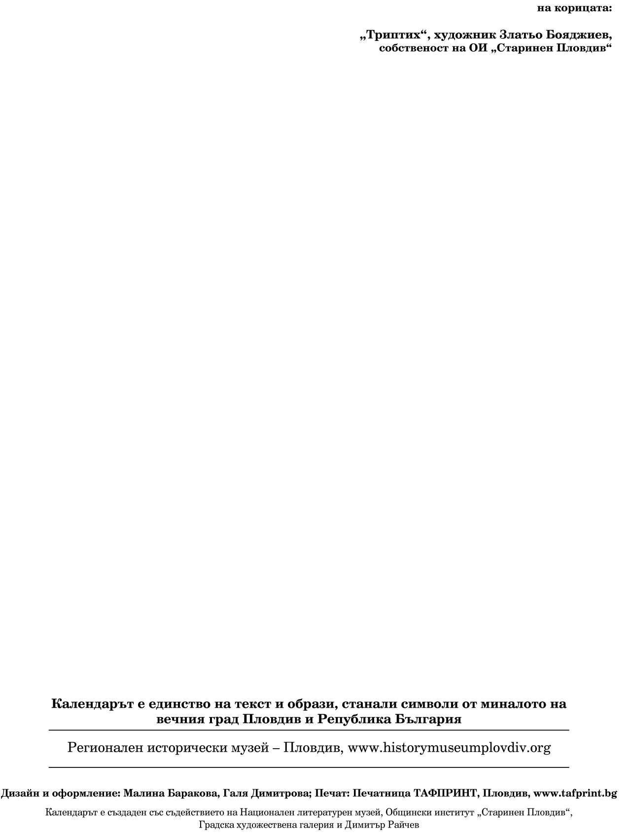 Пловдив – духовният център на България, е свързан със съдбата на плеядата българи, оставили значима диря в националната ни история. Едни от тях, като д-р Константин Стоилов, Асен Христофоров, Магърдич Томасян, са родени в града под тепетата. Други, като Златьо Бояджиев, Христо Г. Данов, Захари Стоянов или Димитър Кудоглу, реализират тук върховете на своето творчество или най-съкровените си мечти. За трети, като българския княз Александър І, градът е свързан с най-величавите моменти на тяхното присъствие в родната ни история. На страниците на този календар са представени 12 от тези българи. За всички тях Пловдив е житейски пристан, място за съзидание и незабравим спомен.