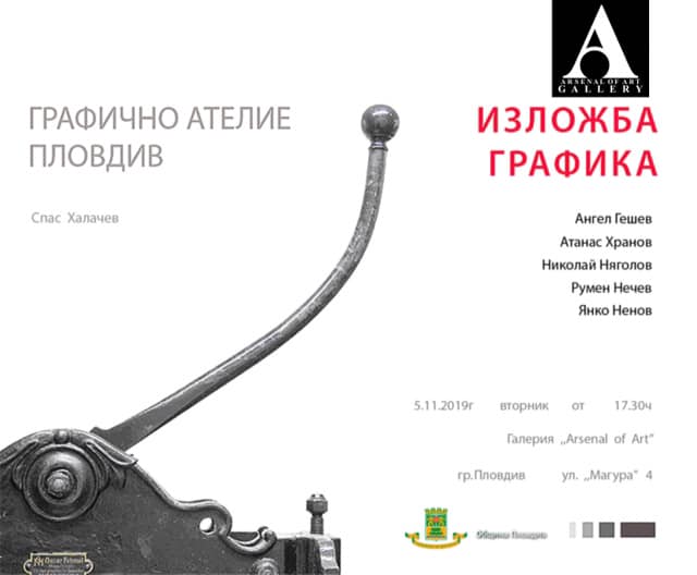 Сдружение „Графично ателие“ кани пловдивчани на откриване на изложба - графика на 5 ноември 2019 г., вторник, от 17.30ч.. в галерия „Arsenal of Art“ в квартал Капана. Събитието се осъществява по проект „Графично ателие – 2019“, подкрепен от Община Пловдив.