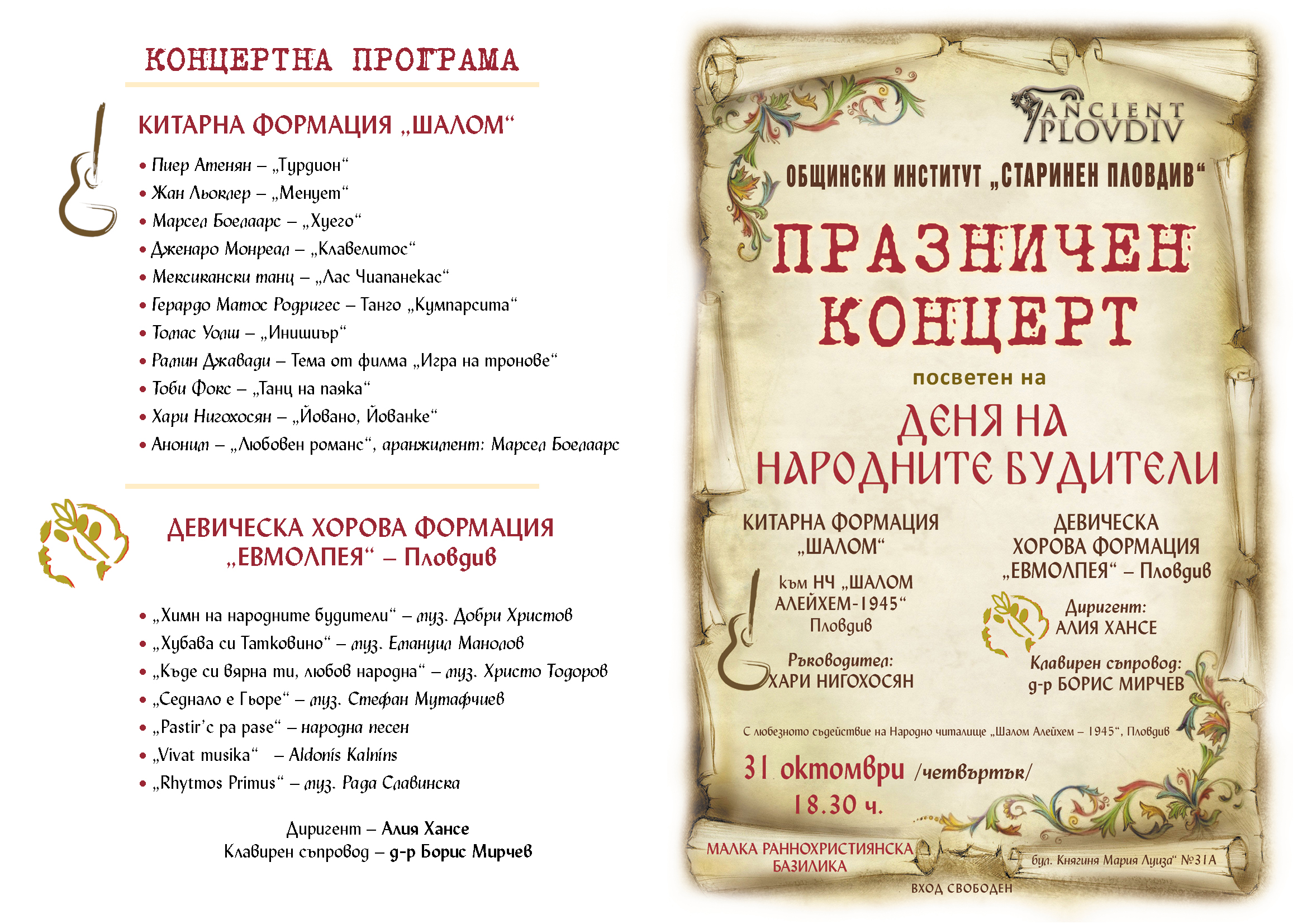 Концерт по повод Деня на народните будители ще зарадва пловдивчани на 31 октомври от 18,30 часа в Малката базилика. Входът е свободен.