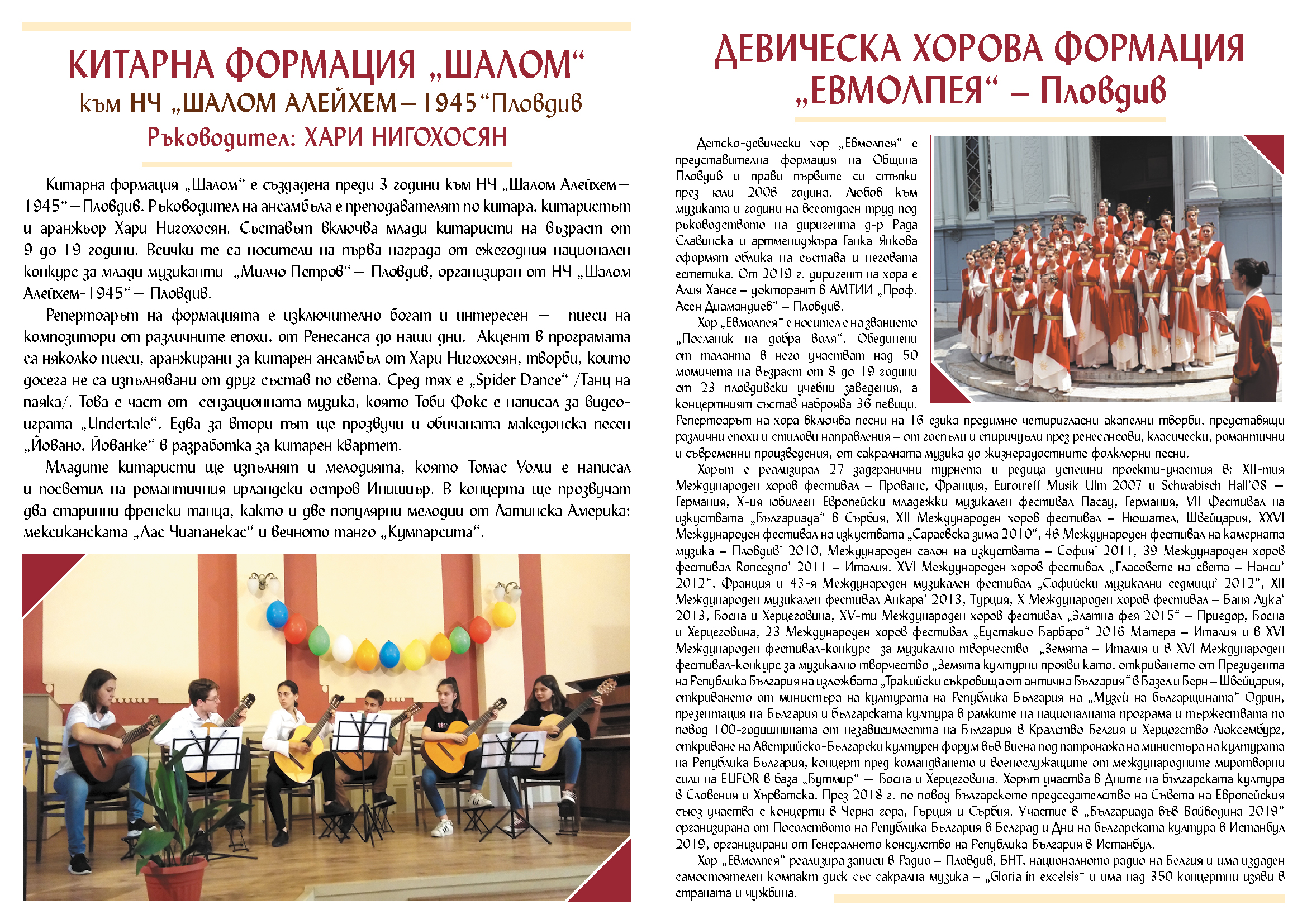 Ще участват китарна формация "Шалом" към читалище "Шалом Алейхем" в Пловдив и девически хор "Евмолпея".
