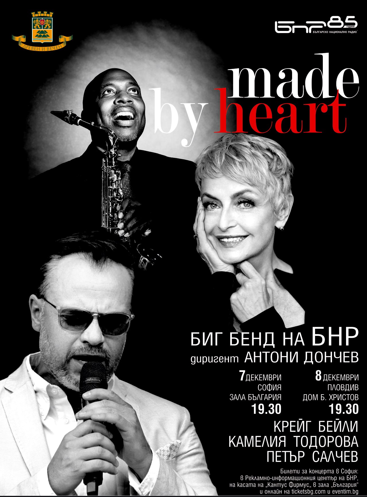 На 8 декември в Дом "Борис Христов", Пловдив Биг бендът на Българското национално радио с диригент Антони Дончев и звездните солисти Крейг Бейли, Камелия Тодорова, Петър Салчев ще представят проекта "Made by Heart". Началото е в 19.30 часа.