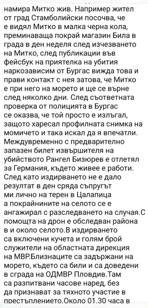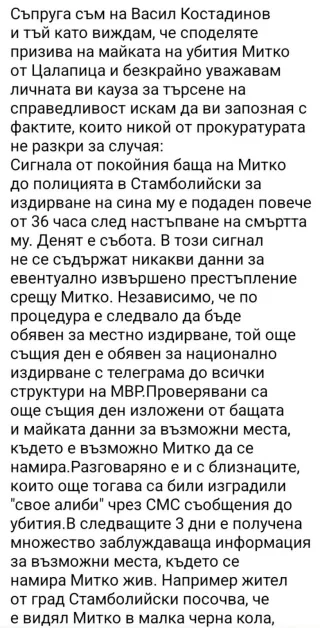 Тя е добавила и скрийншотове от постове на "семейния адвокат" , в който г-жа Костадинова изнася поредица подробности от разследването, които би трябвало да са в кориците на делото и не би следвало да са нейно достояние. Още повече , че самият Костадинов до този момент не е разпитван по делото и това не са публични показания.