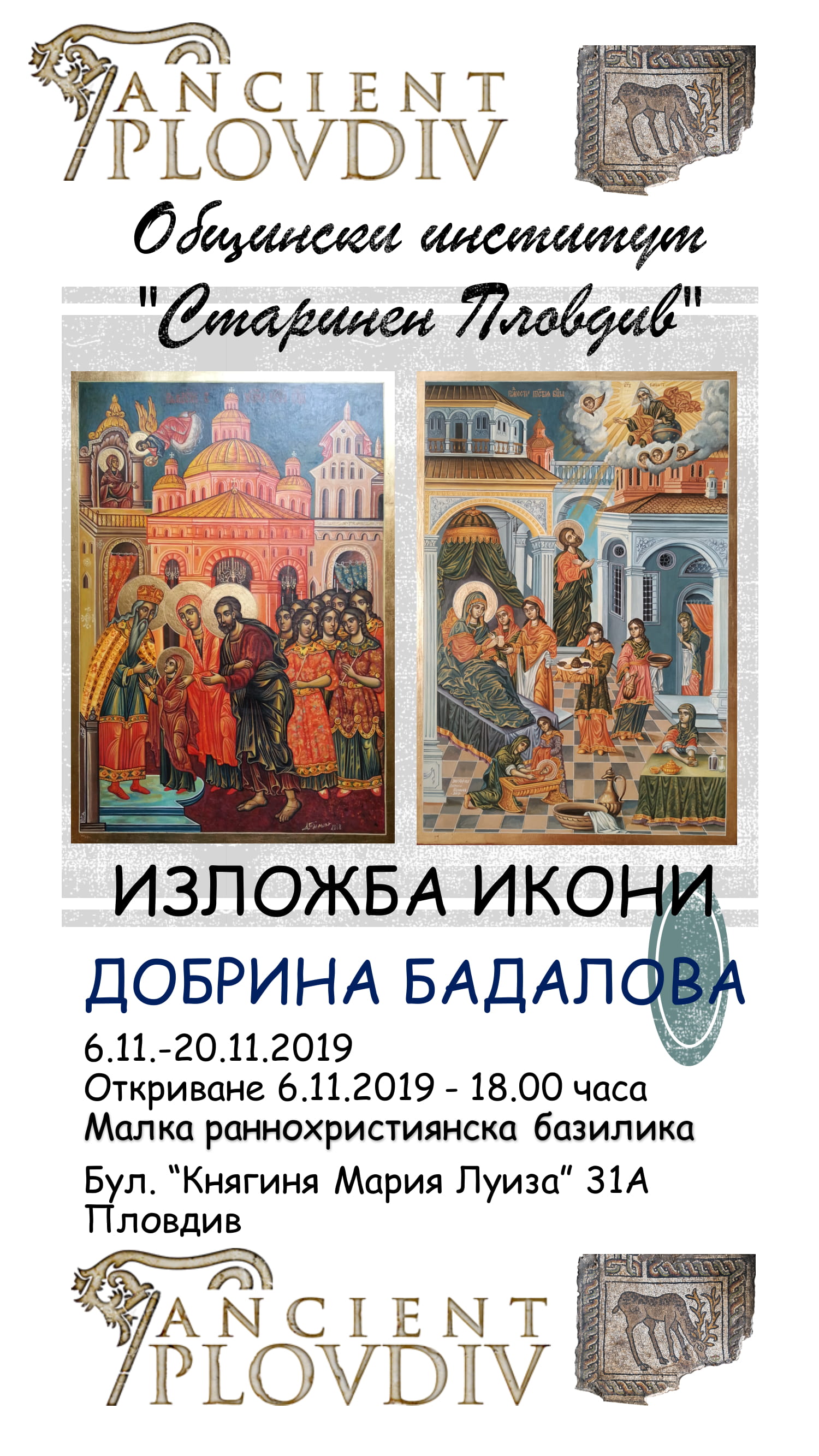 Малката раннохристиянска базилика в Пловдив отваря врати на 6 ноември от 18,00 часа за изложбата от икони на Добрина Бадалова.