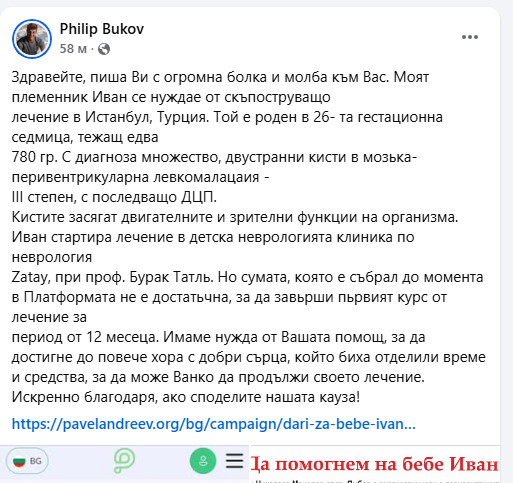 Иван стартира лечение в детска неврологията клиника Zatay, при проф. Бурак Татль. Но сумата, която е събрал до момента в Платформата на Павел Андреев, не е достатьчна, за да се завьрши пьрвият курс от лечение за период от 12 месеца.