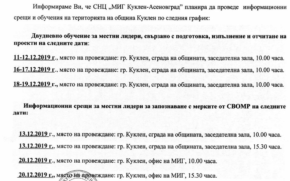Сдружението с нестопанска цел "МИГ Куклен- Асеновград" ще проведе двудневни информационни срещи и обучения за местни лидери в община Куклен или в офиса на МИГ, а темите са подготовка, изпълнение и отчитане на проекти.