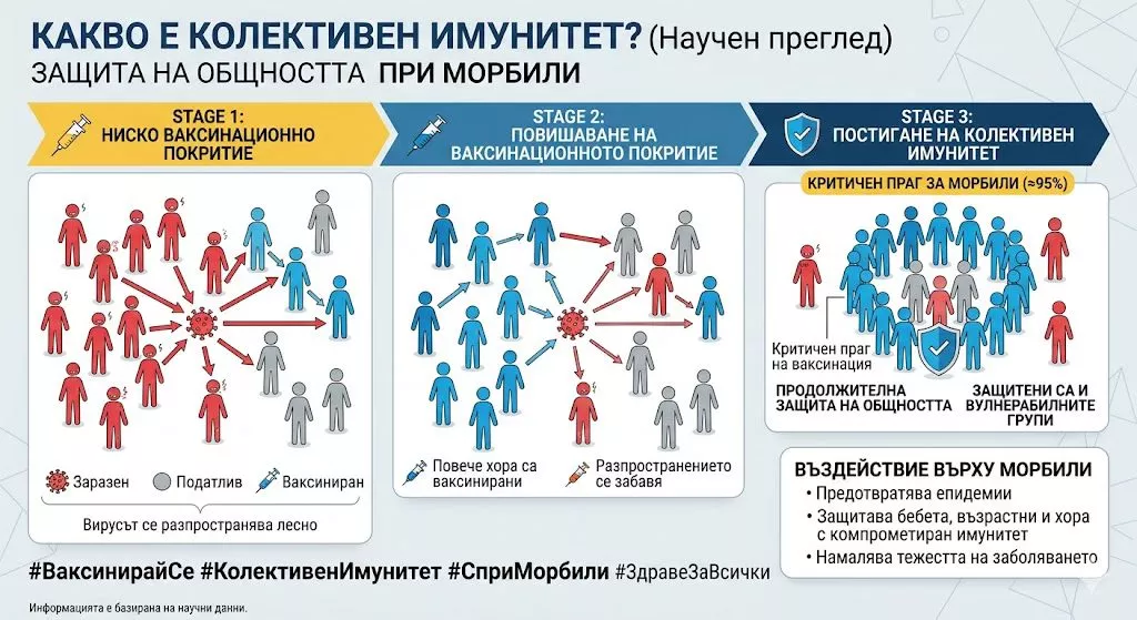 Представете си, че един човек решава да не спази задължителния имунизационен календар и да не постави ваксина срещу морбили на детето си. Това няма да окаже никакво въздействие върху колективния имунитет. Представете си обаче, че повече хора се поддадат на упоритата дезинформация, която умишлено или в резултат на обикновена тъпотия се разпространява, и решат да не ваксинират децата си. Към тези деца добавете неваксинираните, които не са навършили 13 месеца и тези, които не могат да бъдат ваксинирани, защото има медицински противопоказания (най-уязвимите). Какво се случва тогава?