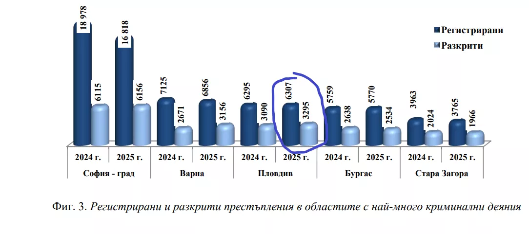 На този фон Пловдив запазва позицията си сред областите с най-висока концентрация на престъпност. С 6307 регистрирани престъпления регионът заема трето място в страната след София-град (16 818) и Варна (6856) и формира 7,8% от всички криминални деяния. Данните показват леко увеличение спрямо предходната година, когато престъпленията са били 6295. Това означава, че въпреки общия спад в страната, в Пловдив се наблюдава задържане на нивата, а не съществено намаление.