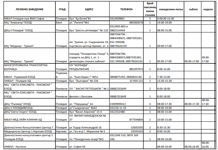 Ето и пълния списък с ваксинационните пунктове в Пловдивска област, публикуван от Регионалната здравна инспекция: