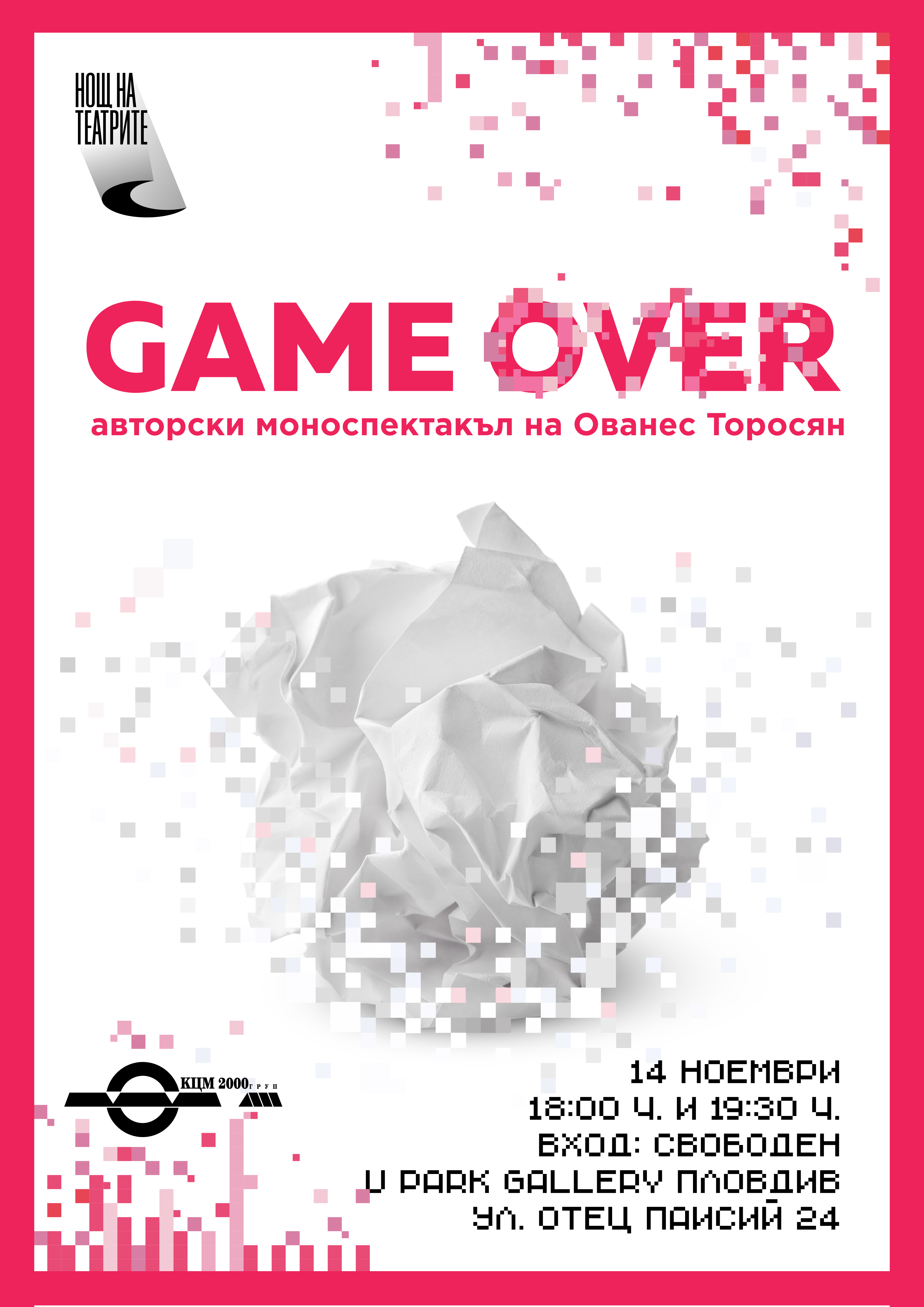 „Game Over” идва в града под тепетата на 14 ноември от 18 и 19.30 ч. в U.PARK Gallery с вход свободен и с приятелската подкрепа на КЦМ 2000 Груп – Пловдив и Театър Реплика. Природата на артиста, пътят към сцената, равносметката, сънищата и реалностите, които обитава всеки от нас, са само част от темите в експерименталния моноспектакъл на Ованес Торосян.