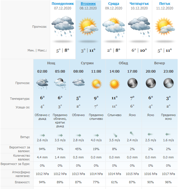 Облачен започва днешният вторник, 8 декември, с минимални температури от 3 градуса. Според прогнозата на sinoptik.bg валежите спират и с напредването на деня живакът ще се покачи до максималните 11 градуса, а по обяд и в ранния следобед слънцето ще се покаже. През нощта ще бъде ясно.