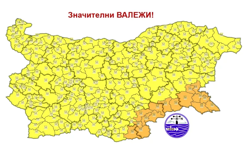 НИМХ издаде предупреждение от втора степен (оранжев код) за значителни валежи в 4 области – Кърджали, Хасково, Ямбол и Бургас за 27 октомври. В останалата част от страната предупреждението е от първа степен (жълт код).