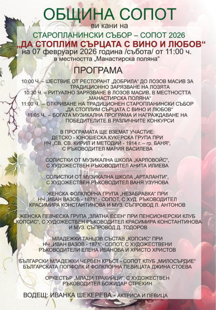 На 7 февруари Община Сопот кани на СТАРОПЛАНИНСКИ СЪБОР „Да стоплим сърцата с вино и любов“, който ще се проведе в местността „Манастирска поляна“.