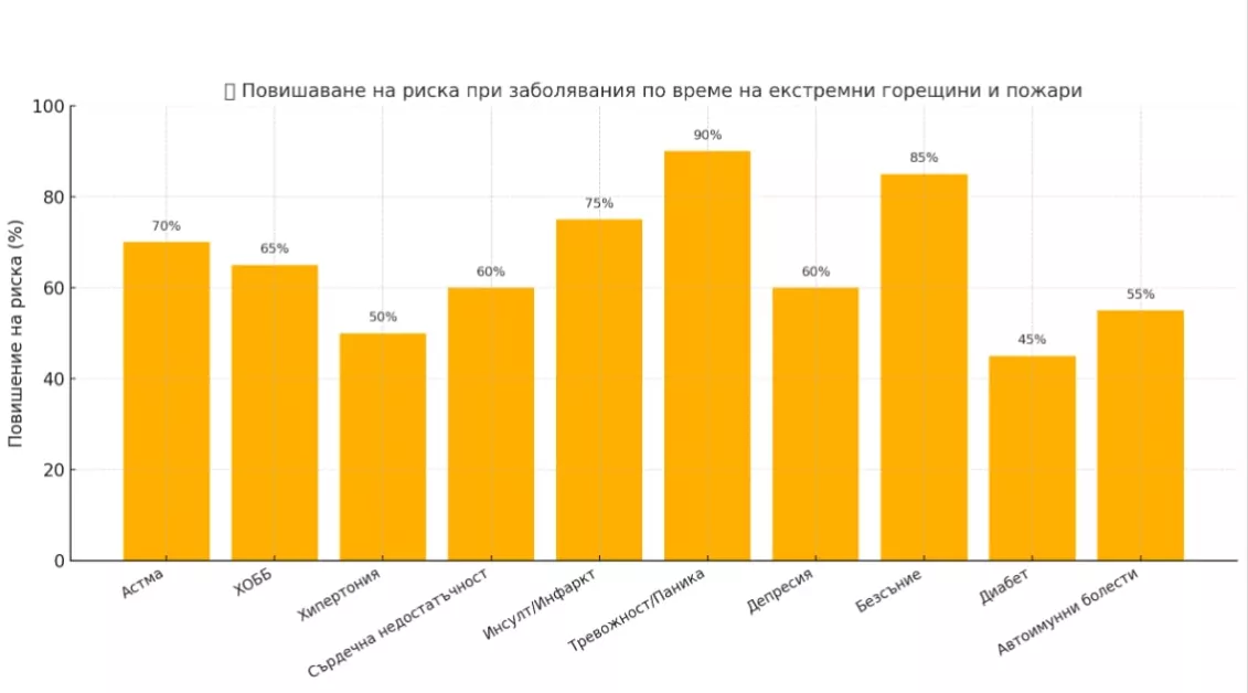 Високите температури през изминалите седмици , горящите пожари в цяла България поставиха на изпитание психиката и физиката ни. По данни на европейската система EFFIS България през юли 2025 е на първо място в ЕС по изгорели площи спрямо средното за периода. Според Системата за качеството на въздуха в реално време показателите в почти цяла България са силно влошени. Въздухът в дните с пожари има повишени стойности на PM2.5 и PM10, а понякога дори превишава безопасните нива в няколко поредни дни.