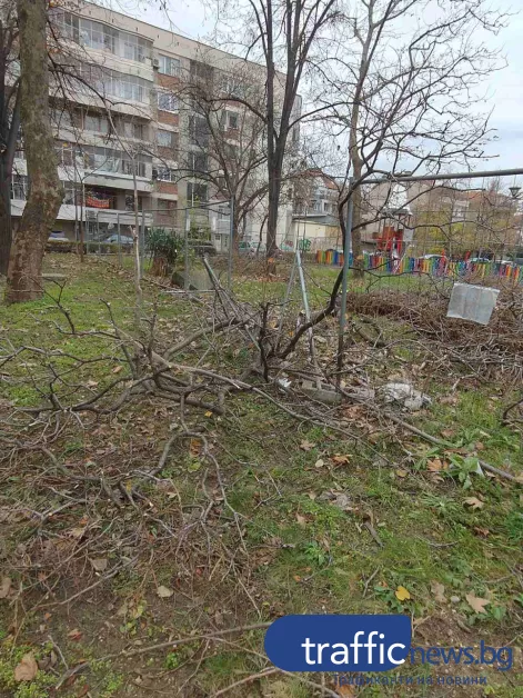 Тогава при един от опитите за кастрене, клони паднаха опасно близо до мястото за игра, а едно от дърветата остана с частично изрязано стъбло и риск да се стовари върху оградата.