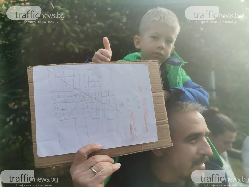 5-годишния Калоян също се обяви срещу изсичането на дървета с цел на тяхно място да изникнат сгради. По свое желание той е нарисувал и плакат, с който днес застана пред сградата на областна.