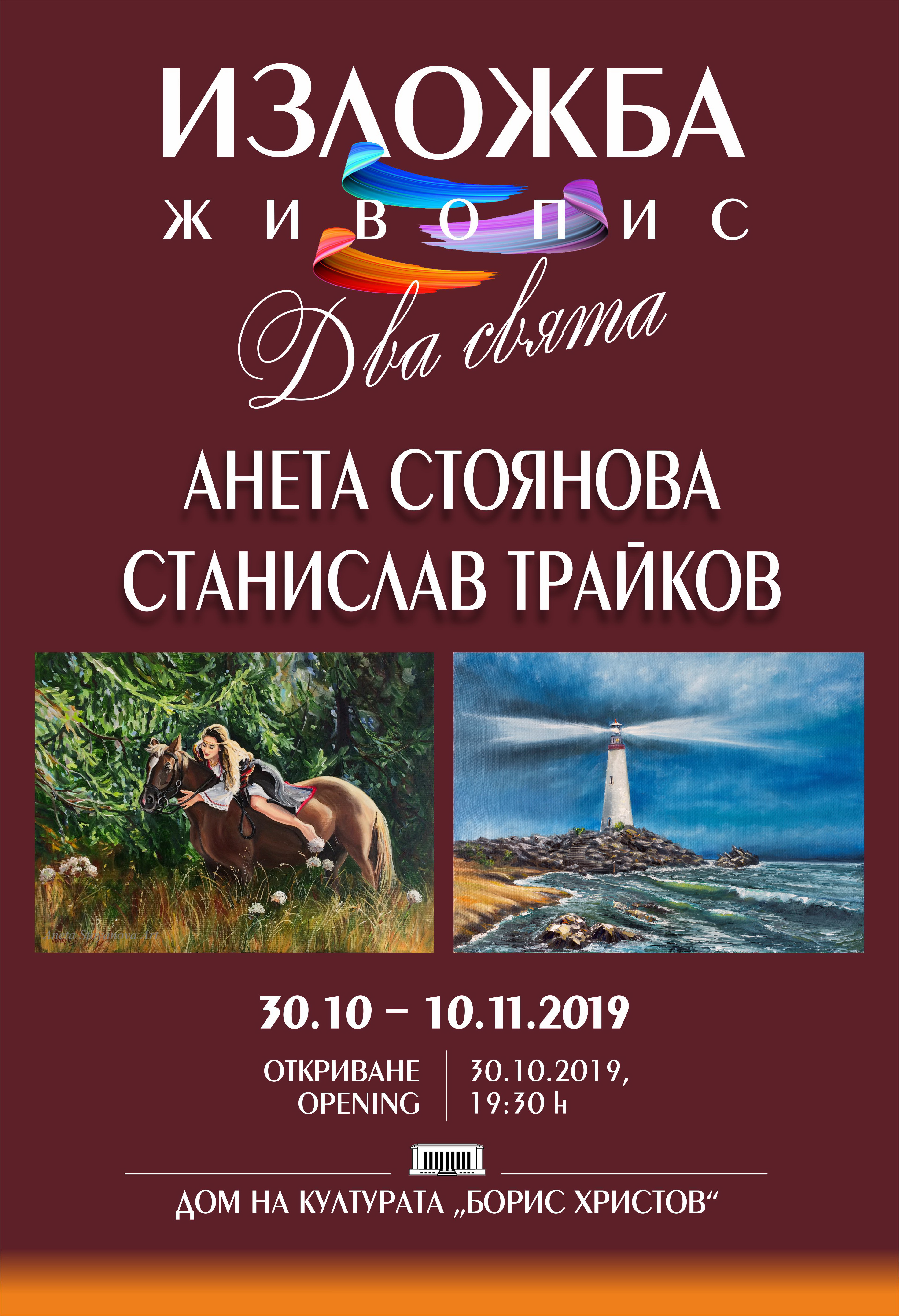 Изложбата „Два свята“ на Анета Стоянова и Станислав Трайков ще бъде открита на 30 октомври 2019 г. от 19.30 часа във фоайето на Дома на културата „Борис Христов“ и ще може да се види до 10 ноември 2019 г.