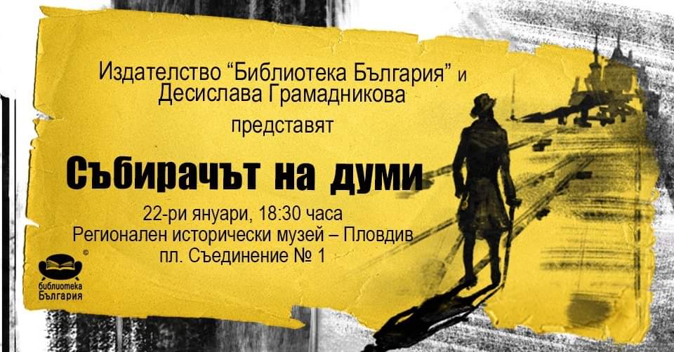 Издателство "Библиотека България", в партньорство с Община Пловдив ви канят на премиерата на дебютната книга с разкази на фотографа Десислава Грамадникова, носеща името "Събирачът на думи".