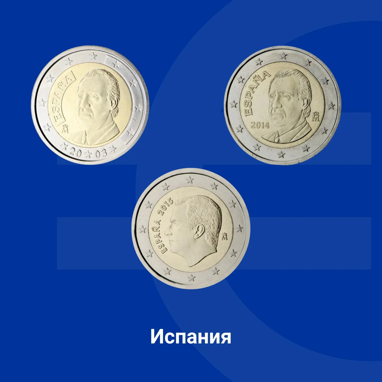 На монетите от 2 евро в първата и втората серия е изобразен портрет на крал Хуан Карлос I де Бурбон.