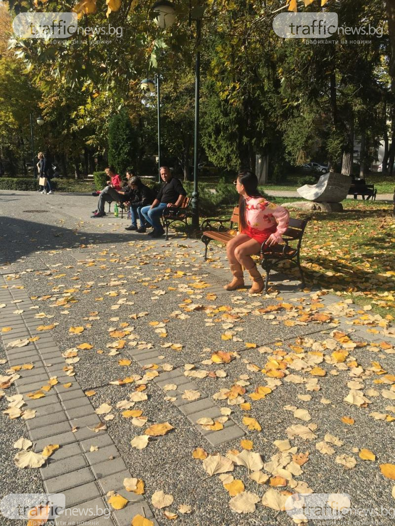 Топъл и слънчев бе съботният ден в Пловдив. По обяд термометърът мина 20 градуса. Главната улица и Цар-Симеоновата градина бяха изпълни с хора, които се радваха на хубавото време. Някои пловдивчани дотолкова се вдъхновиха от нетипичните за ноември температури, че хвърлиха горните дрехи и се пуснаха по фланелки.