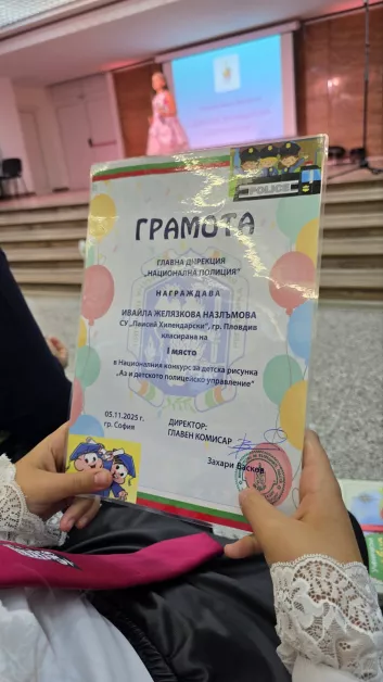 Четвъртокласничката Ивайла Назлъмова от СУ " Св. Паисий Хилендарски" спечели първа награда в петото издание на конкурса за детска рисунка "Аз и моето полицейско управление", организиран от Министерство на вътрешните работи.