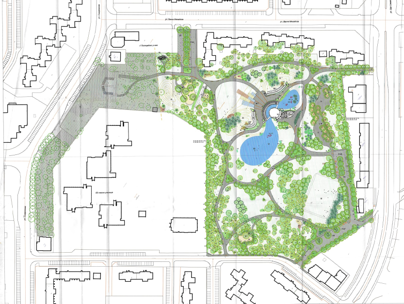 Предвижда се изграждането на открита сцена с обслужваща сграда и амфитеатрална трибуна с 194 седящи места, три водни площи с общ обем над 1400 куб. метра и автоматизирана поливна система, използваща вода от два сондажни кладенеца. Озеленяването ще обхване над 65% от терена – повече от 50 декара тревни площи, близо 900 дървета и над 20 000 храста. Засадените видове ще бъдат подбрани така, че да създадат разнообразна и устойчива екосистема – чинар, летен дъб, клен, явор, магнолия и японски клен.